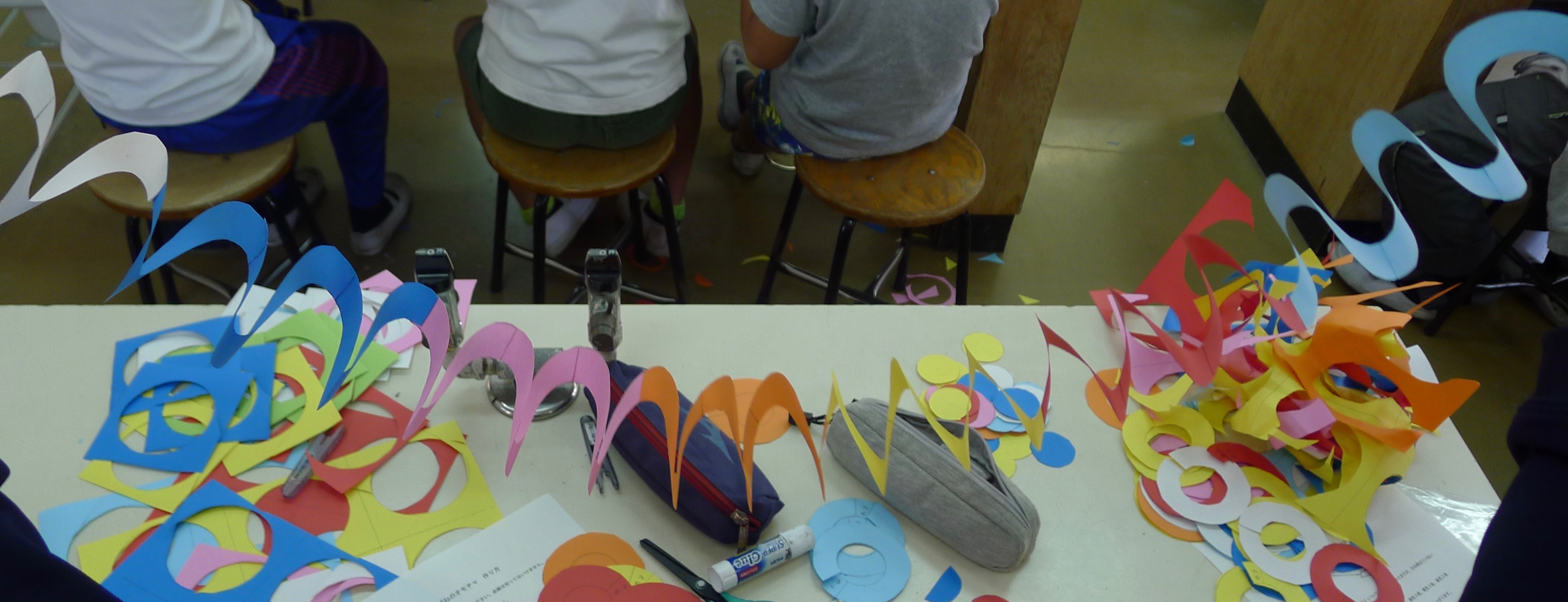 一般的には金属のバネが多いのですが、この体験教室ではバネをもっと身近に考えてもらうため、7色の紙を使い、紙製のバネを作りました