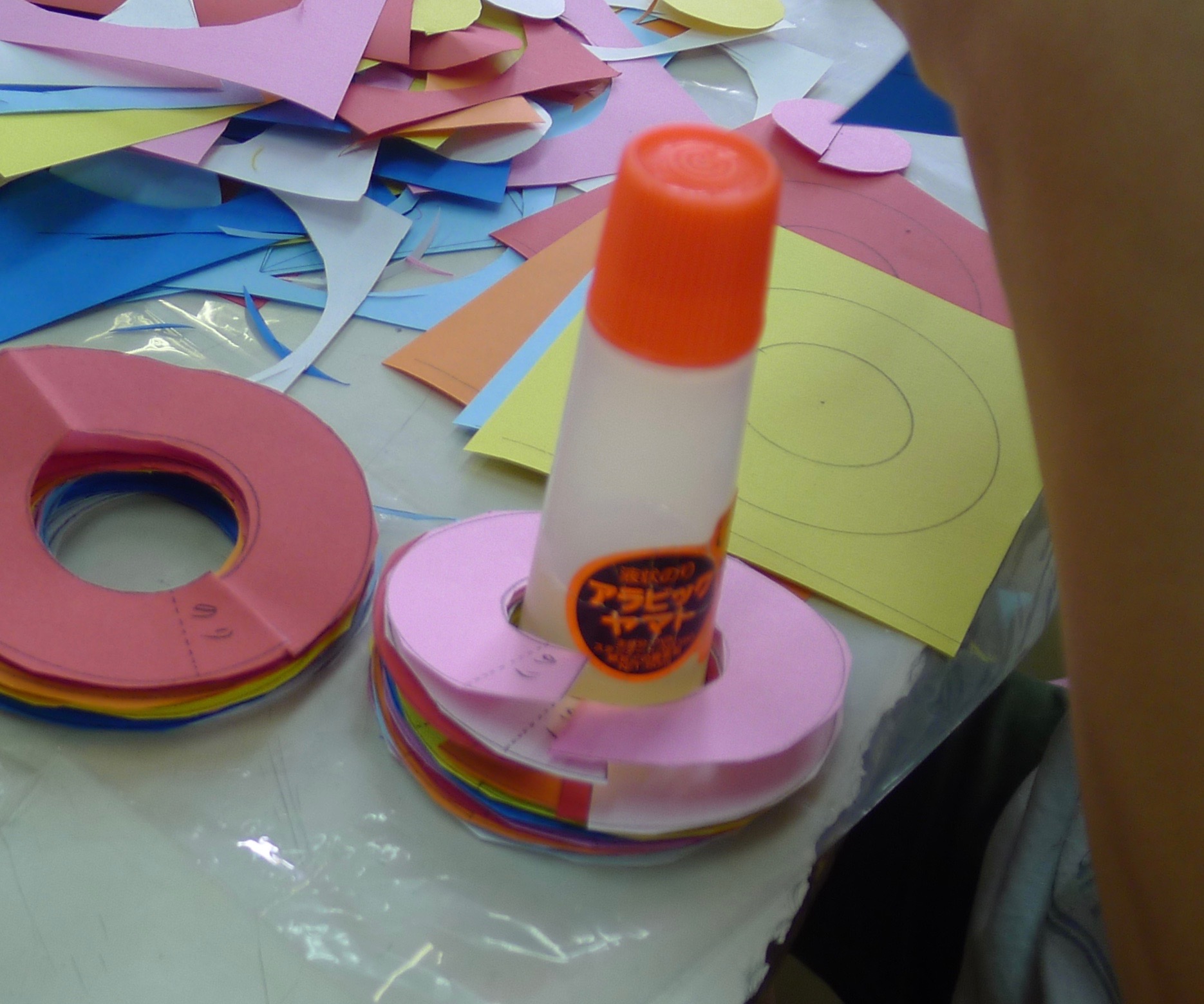 ひたすら円を切ったら、次は色を選んで紙と紙を糊でつなげていきます。