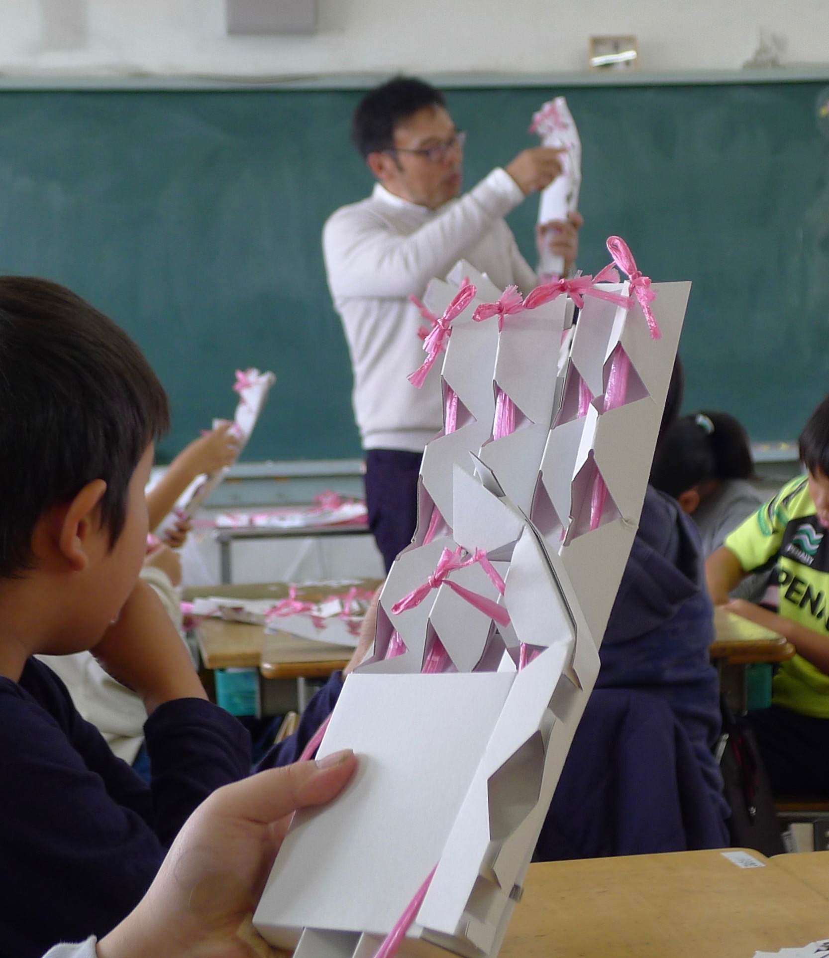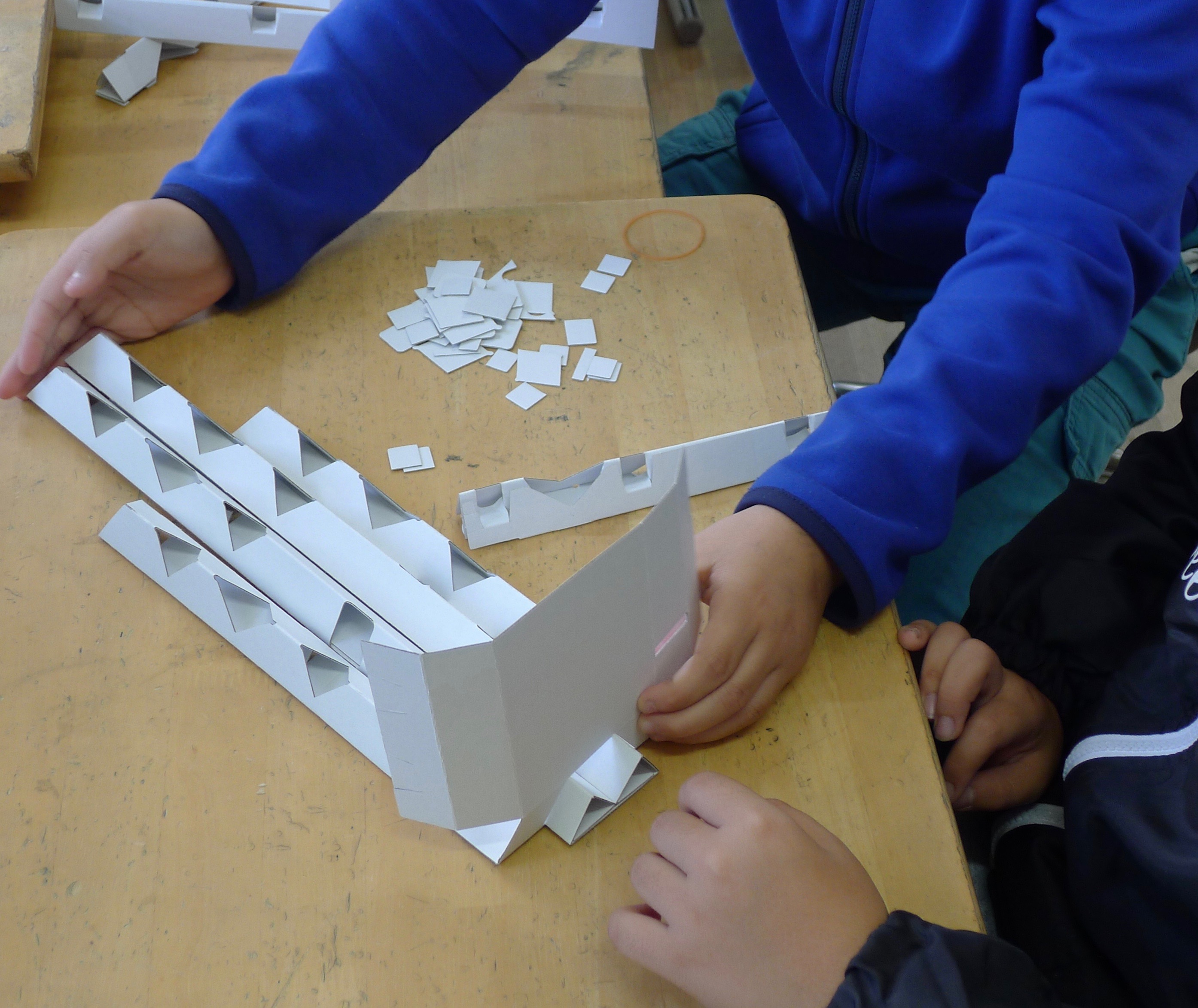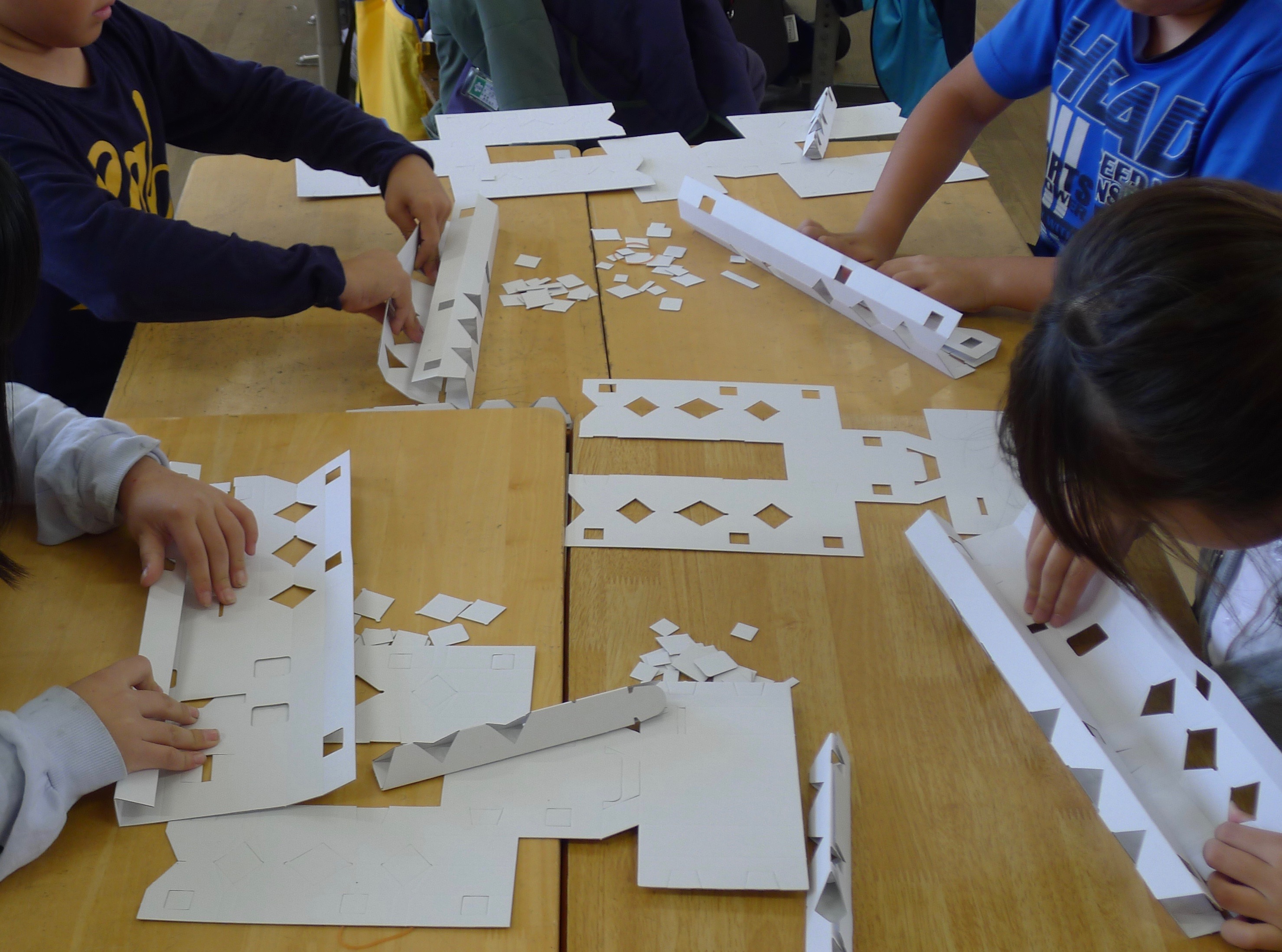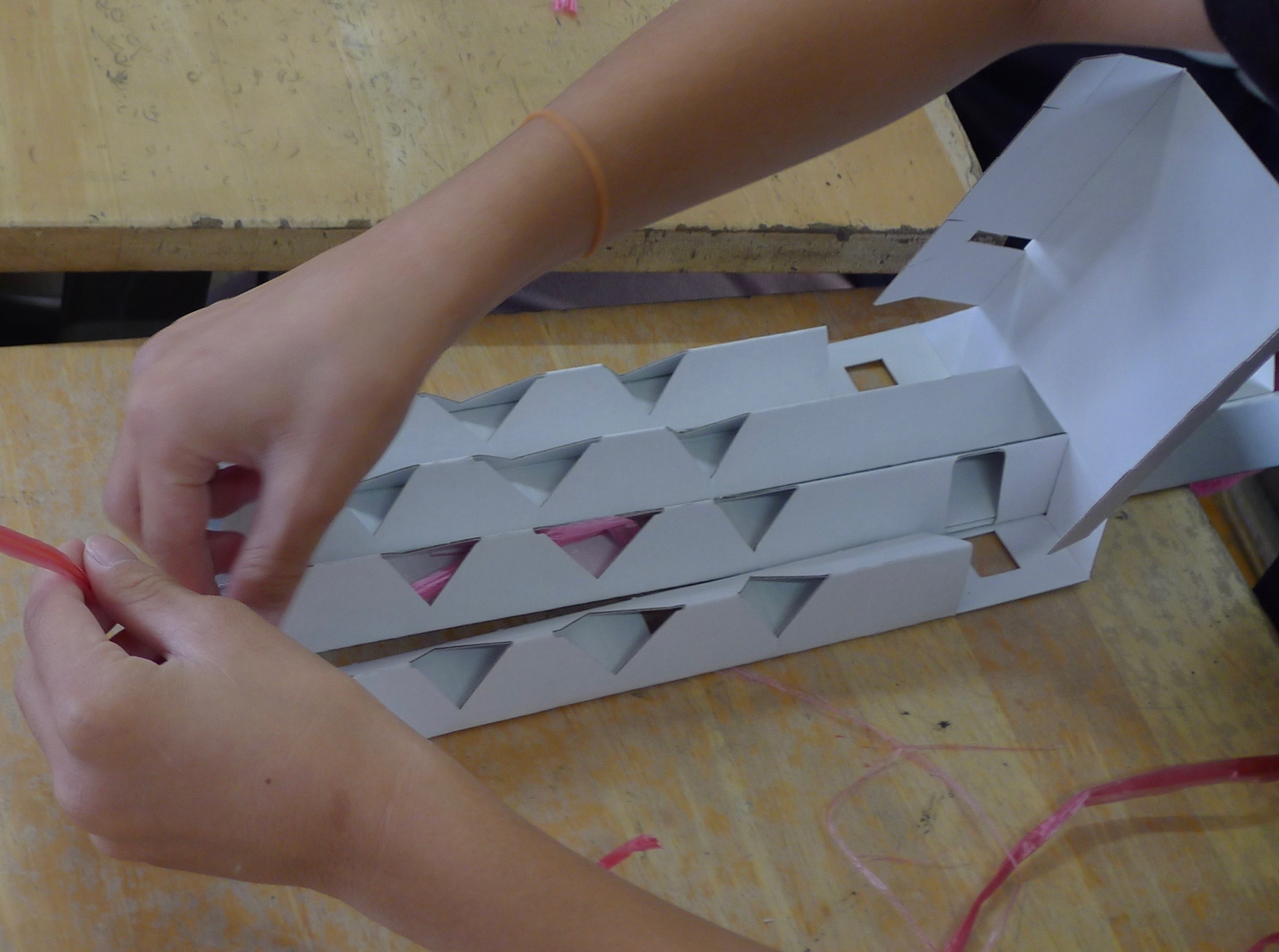 紐を筒の中にうまく入れるため、ダンボールを机のどの位置に置くかを考えながら作業します