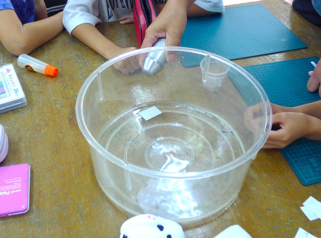 普段は見えない“磁力線”を視覚的にとらえるために、着磁したクリップを水に浮かべて方位磁石を作る実験も行いました。