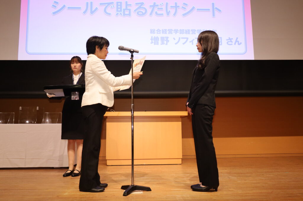 総合経営学部3年生の、塩野ソフィア美羽さんのアイディア、「のりがいらない!シールで貼るだけシート」を授与させていただきました。