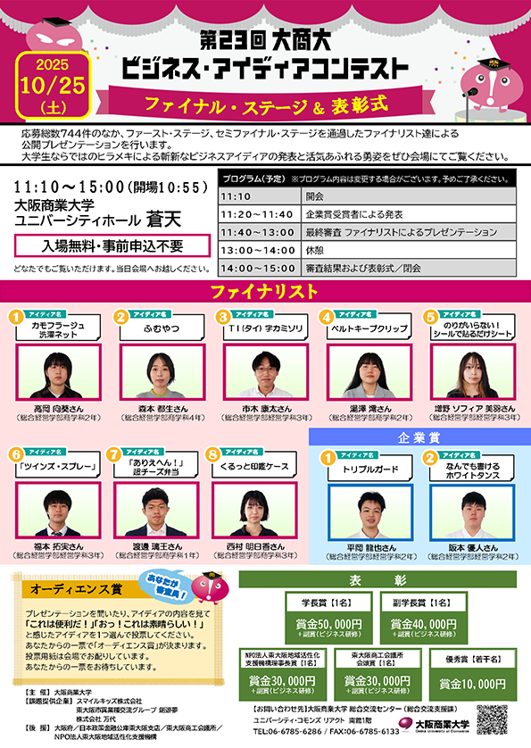 大阪商業大学 ユニバーシティホール蒼天にて開催されたファイナルステージで、各ファイナリストのプレゼンをじっくりと聞かせていただきました。